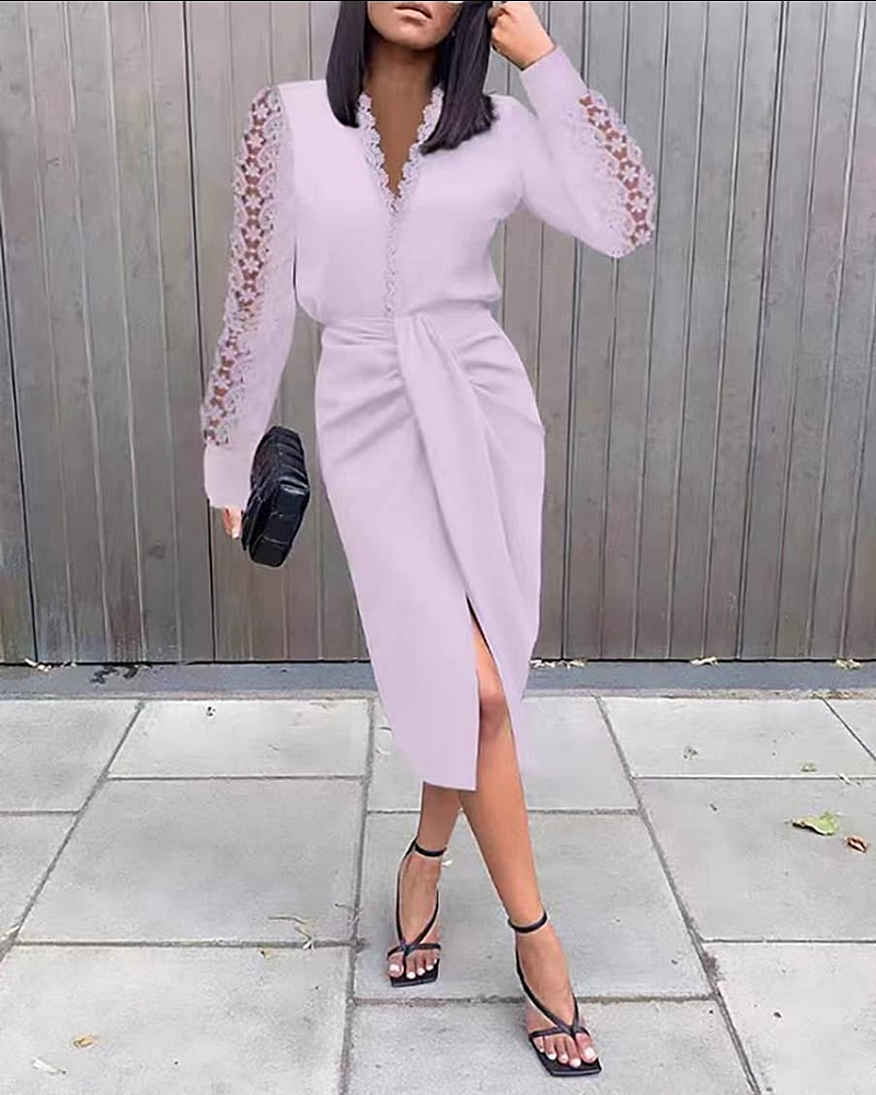 V-neckline with Delicate Lace Trim, Long Sleeves with Open Lace Embroidery, and a Distinctive Front Twist/Knot Detail at the Waist That Leads into a Wrap-Style Skirt with a Slit