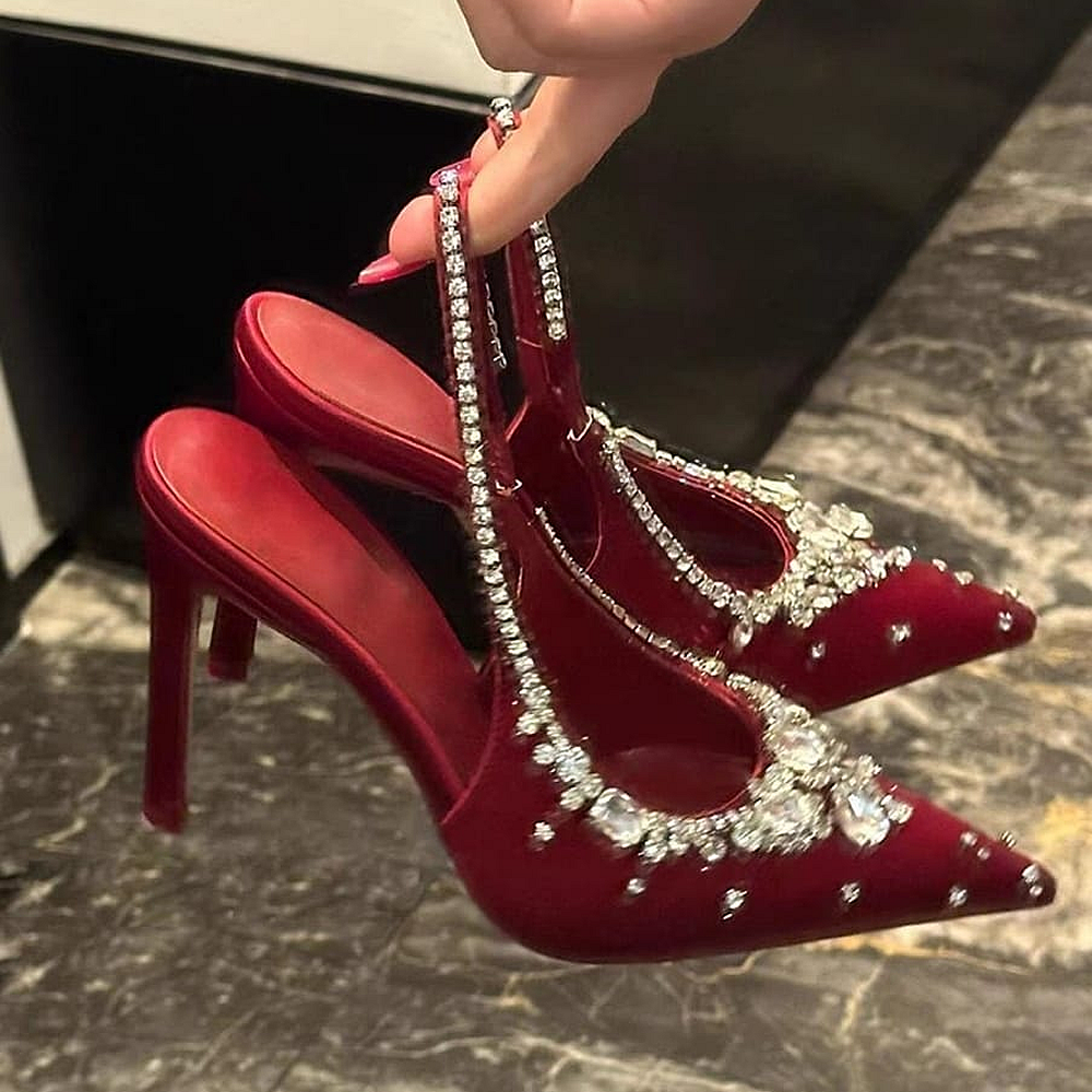 The refined structure creates a timeless shape that complements both modern and classic wardrobes, making these heels a versatile choice for elevated styling, surface of the shoe is richly adorned with sparkling rhinestone embellishments, carefully arranged to catch and reflect light with every movement.