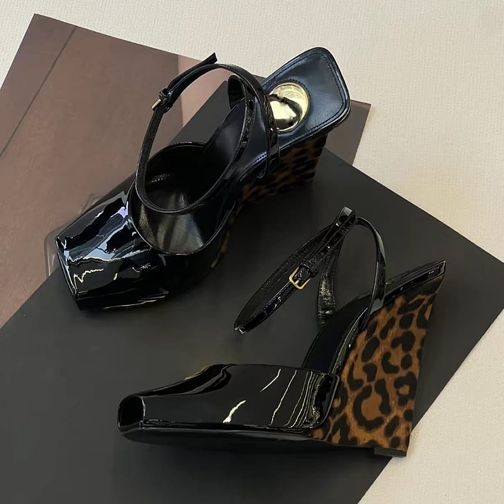 Adding a touch of playful sophistication, the leopard-printed wedge heel introduces a striking contrast and fashion-forward detail. Its sculpted design provides stability and comfort while elevating the overall aesthetic, making the sandals as practical as they are eye-catching open-toe style enhances femininity, while adjustable straps ensure a secure and customized fit.
