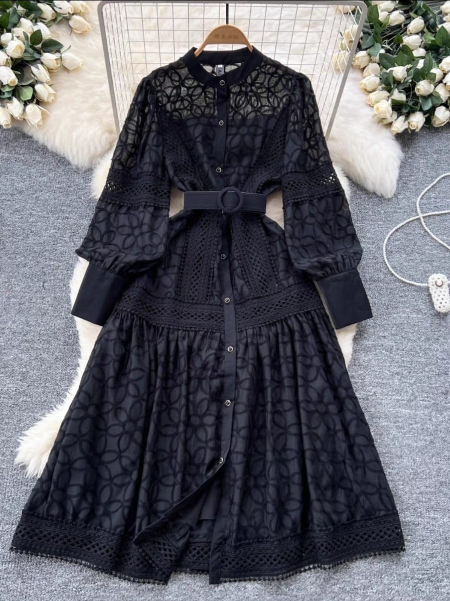 Discover unparalleled sophistication! This exquisite lace maxi dress features intricate embroidered patterns, a chic mandarin collar, and elegant voluminous sleeves. Complete with a flattering buckle belt and delicate crochet lace accents. Available in captivating Royal Blue, timeless Classic Black, and ethereal Nude Beige. The epitome of refined modest luxury.