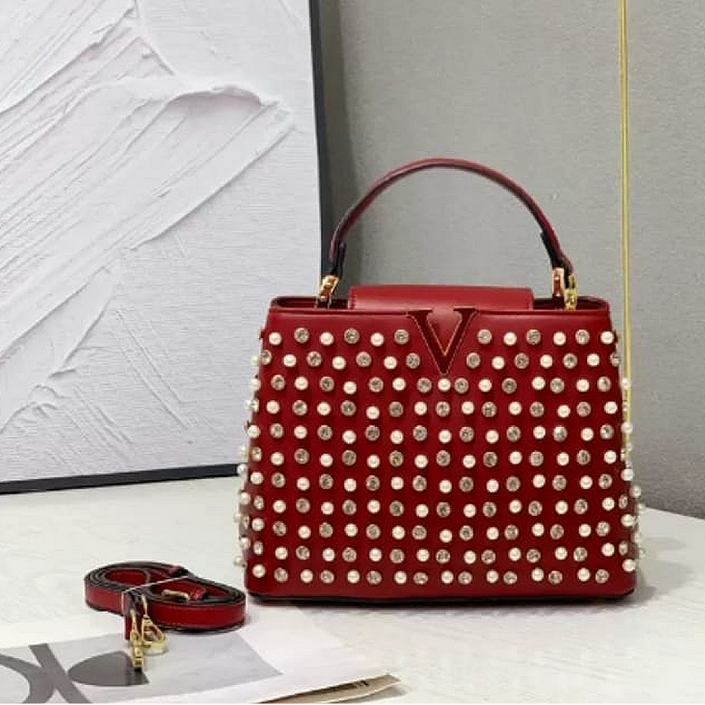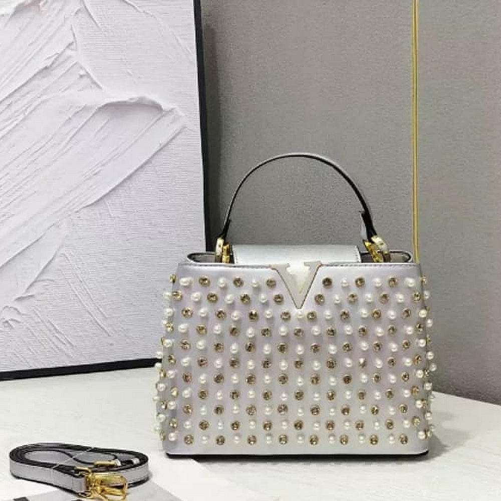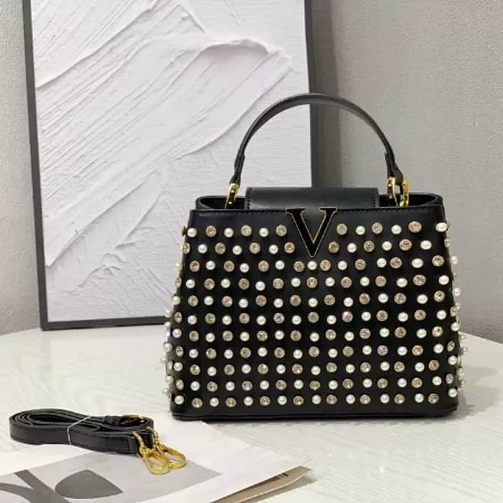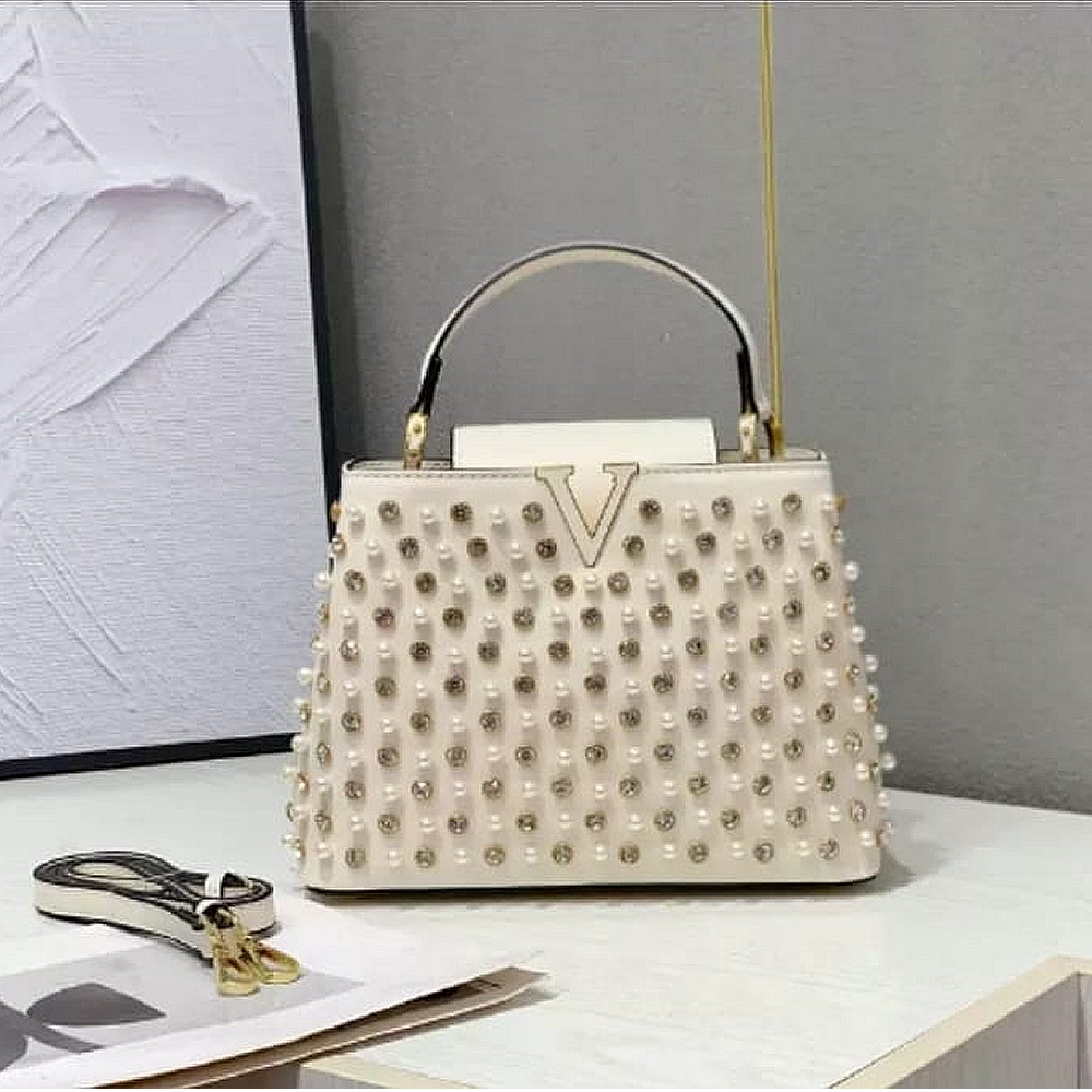 It includes elegant pearl embellishments for a luxurious feel and a prominent “V” shaped logo, the combination of luxurious materials, meticulous craftsmanship, and distinctive branding points to a high-end fashion accessory.