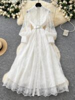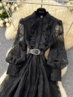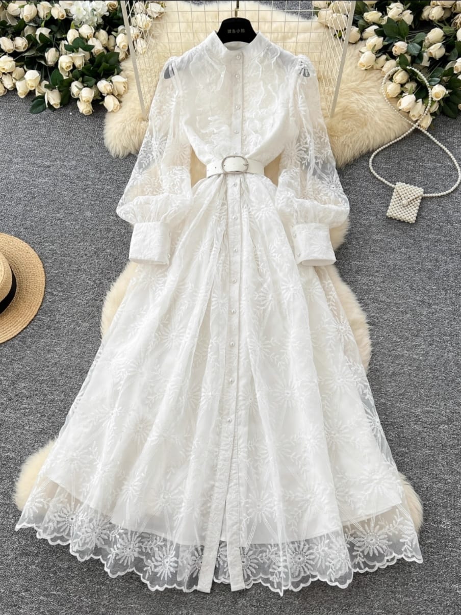 - The Flattery Formula: The high stand collar and cinched statement belt (in black or white) create a perfectly defined waist, leading into a voluminous, flowing A-line skirt that is universally flattering and graceful.