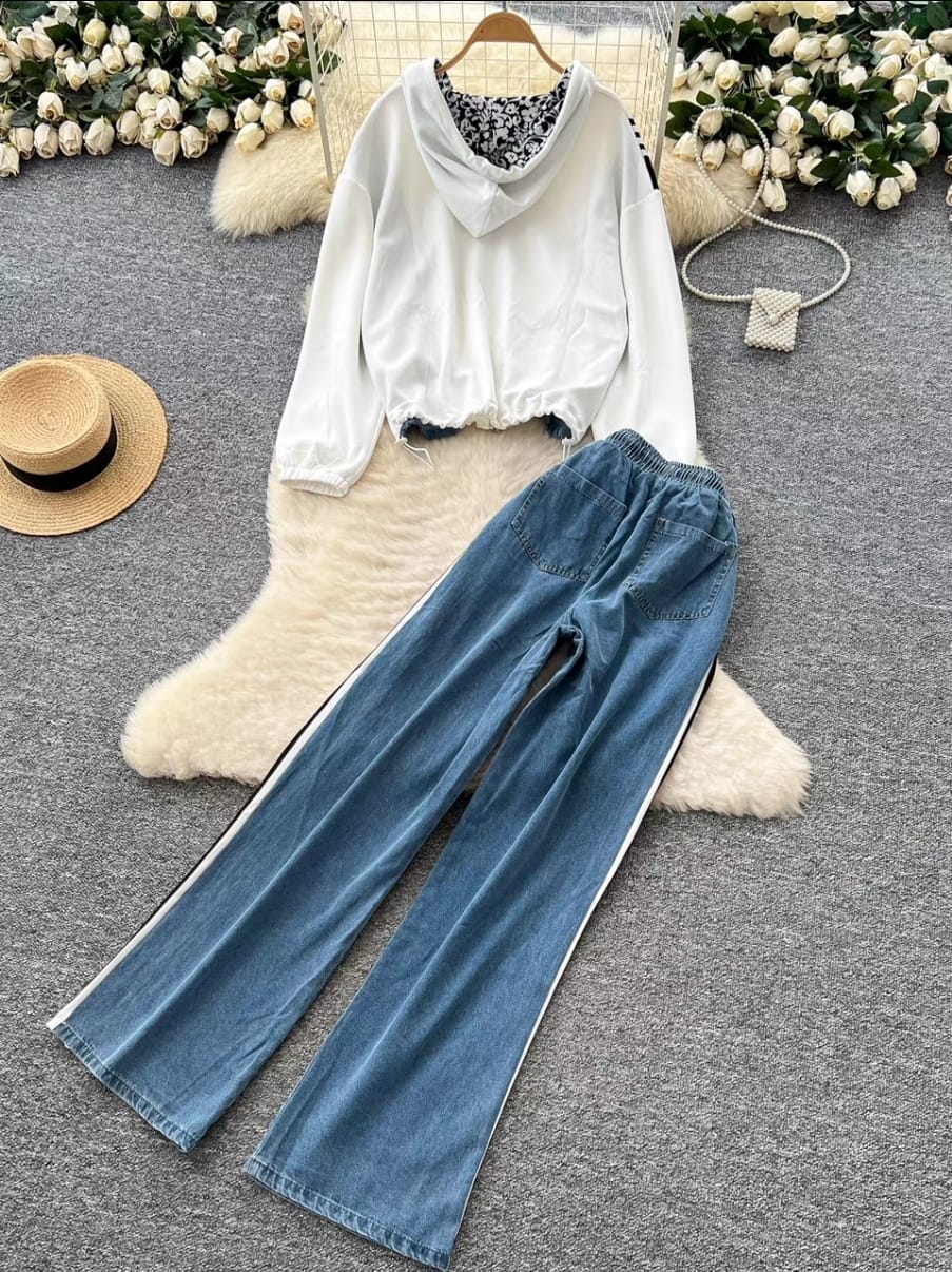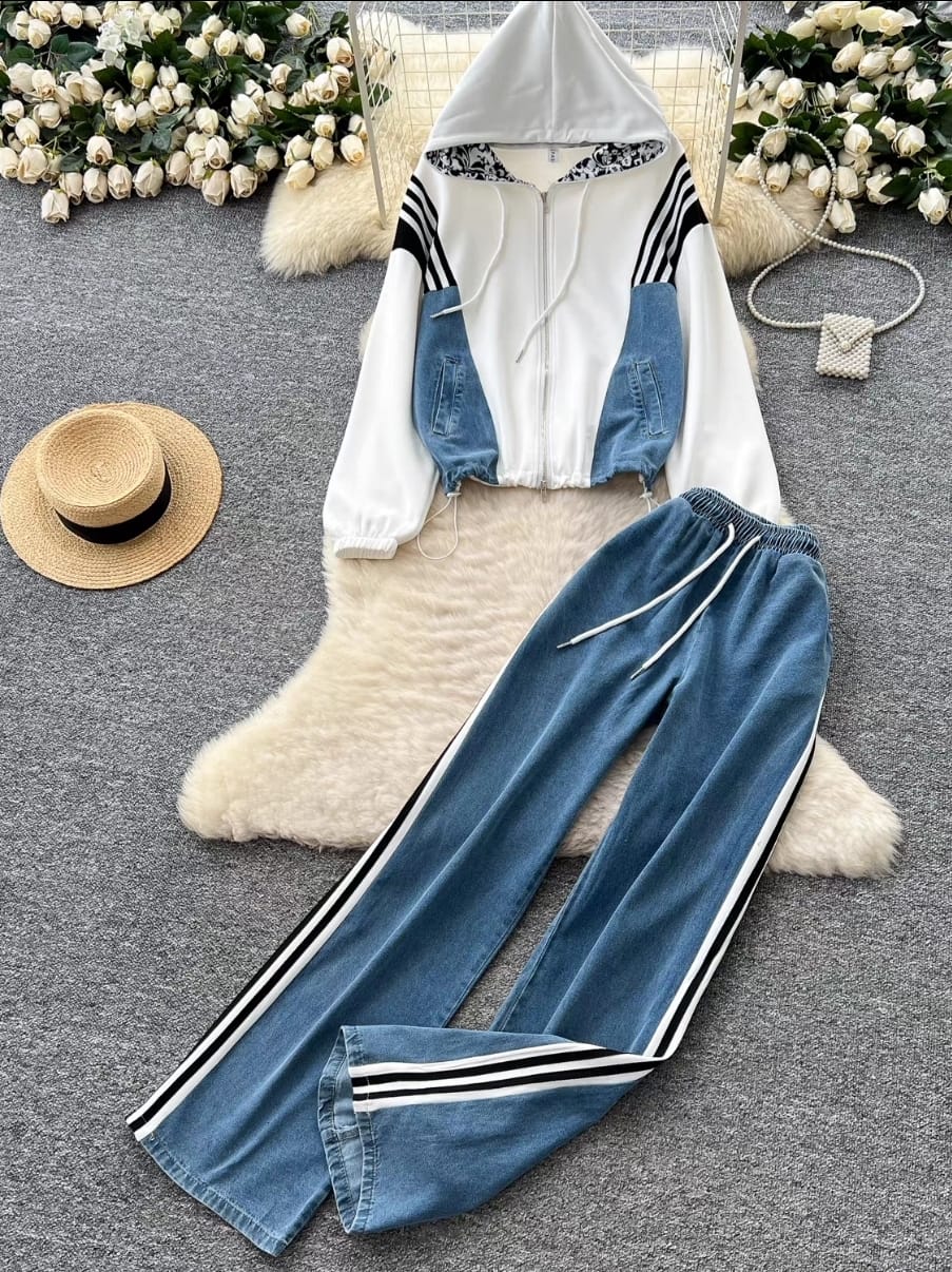 Stylish and contemporary two-piece outfit featuring a distinctive half-and-half design of fabric and denim.